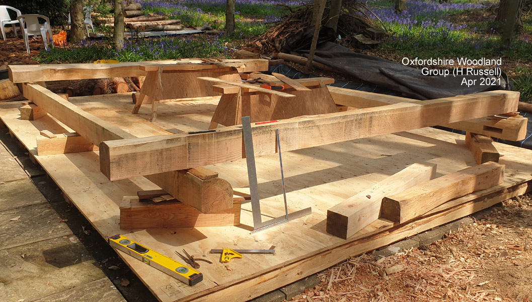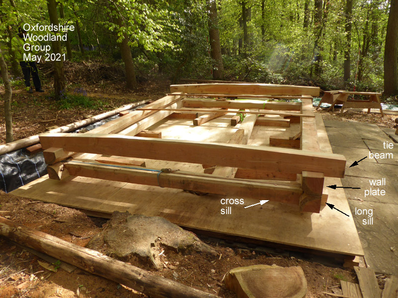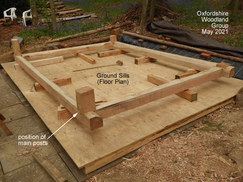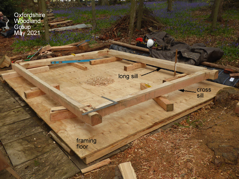 The long and cross sills have now been double cut and pulled together into their finished position. Some offcut sill sections have been positioned on top of the sills to show the location of the four corner posts. Next job is to make the wall plate and tie beam frame.