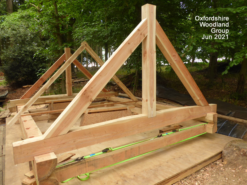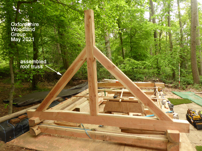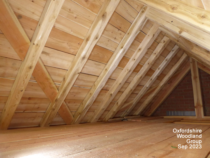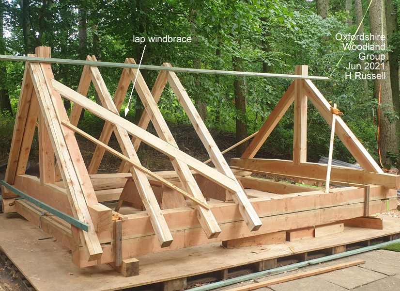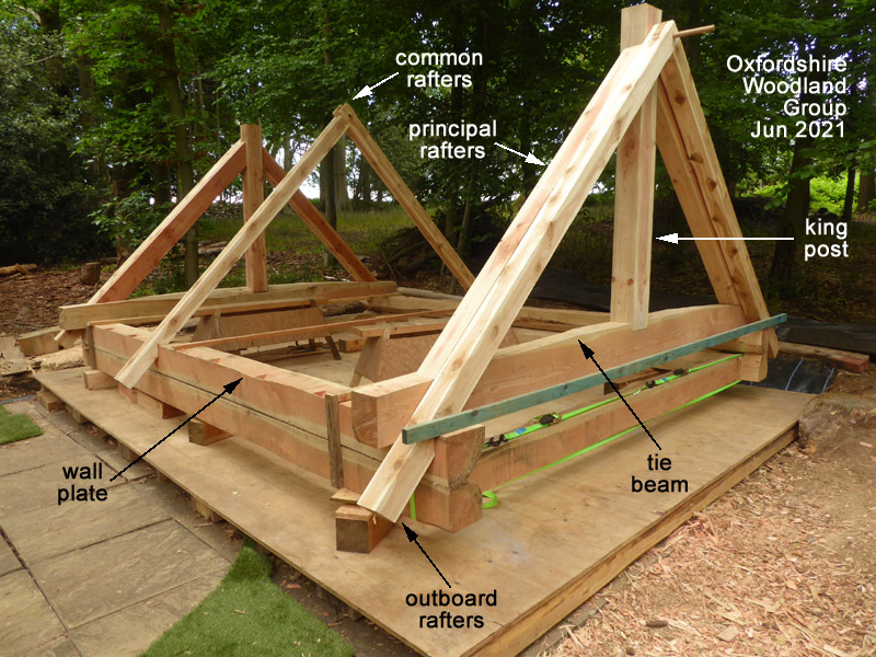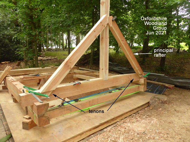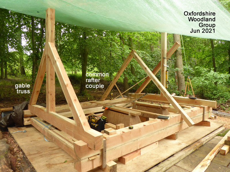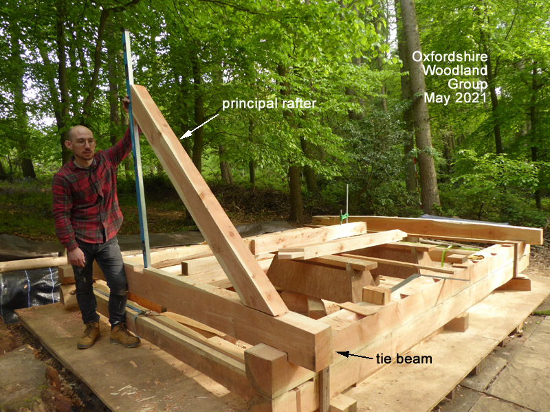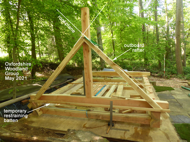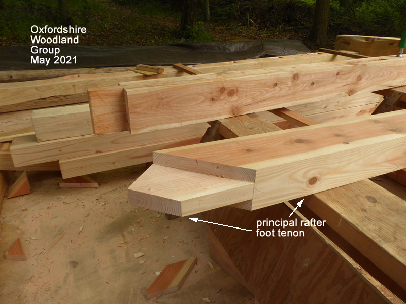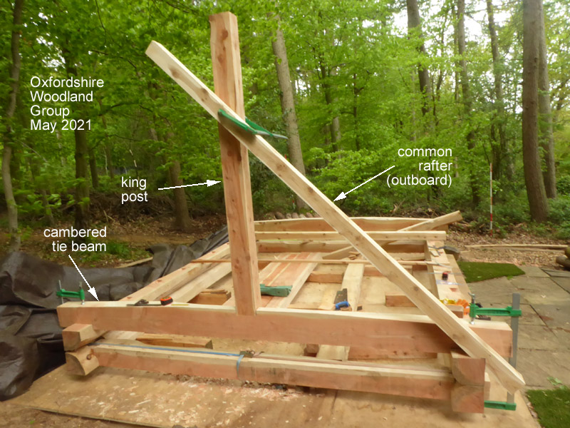 The outboard rafters will be cut and fitted together at the peak using a bridled joint and then the principal rafters that sit on the cambered tie beam immediately behind the outboard rafters will be scribed into the king post and cambered tie beam using the common outboard rafters to provide a profile template.