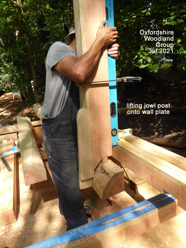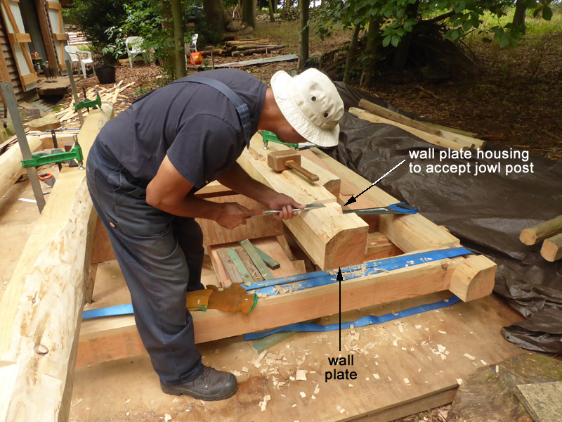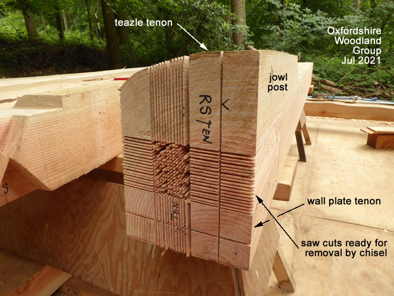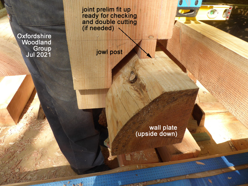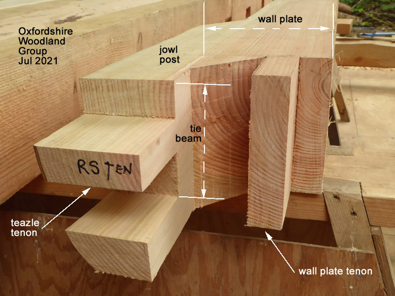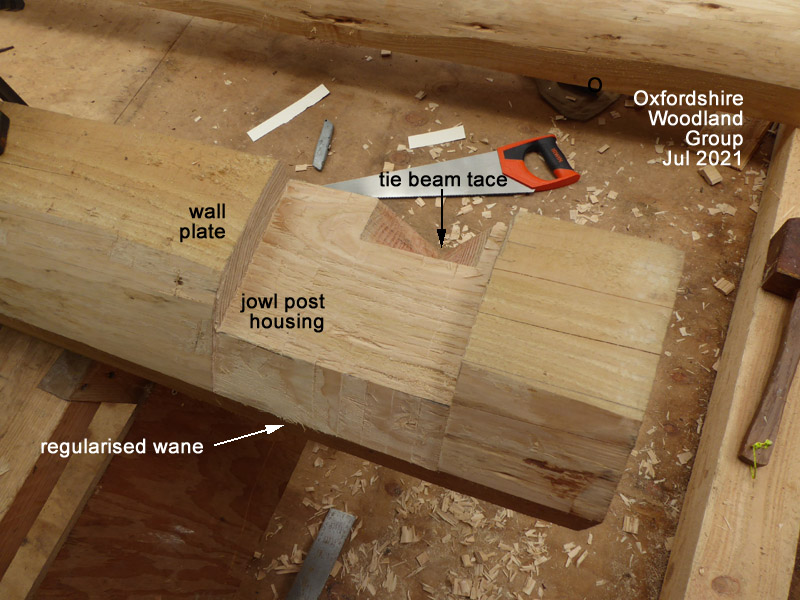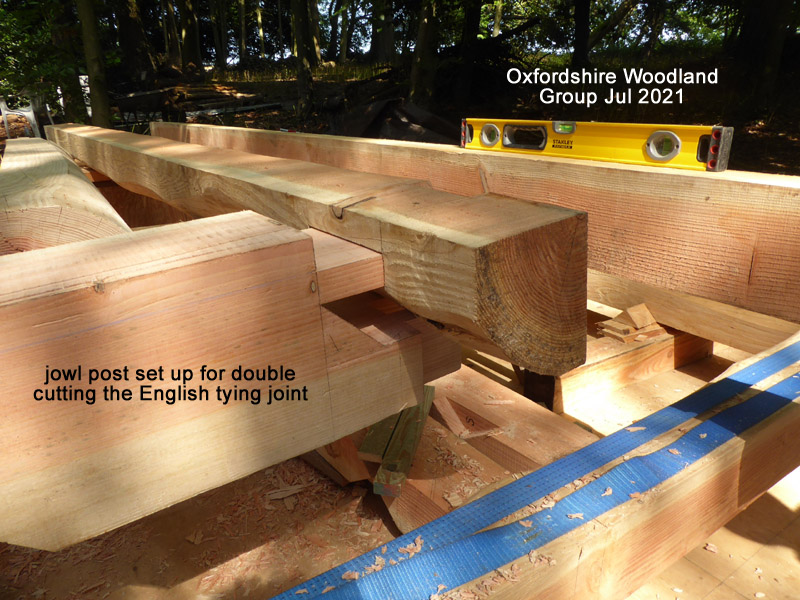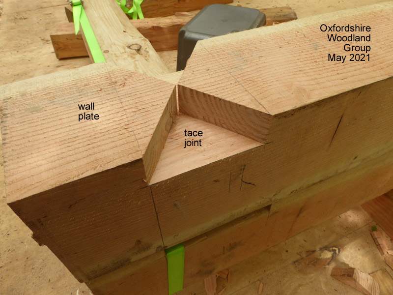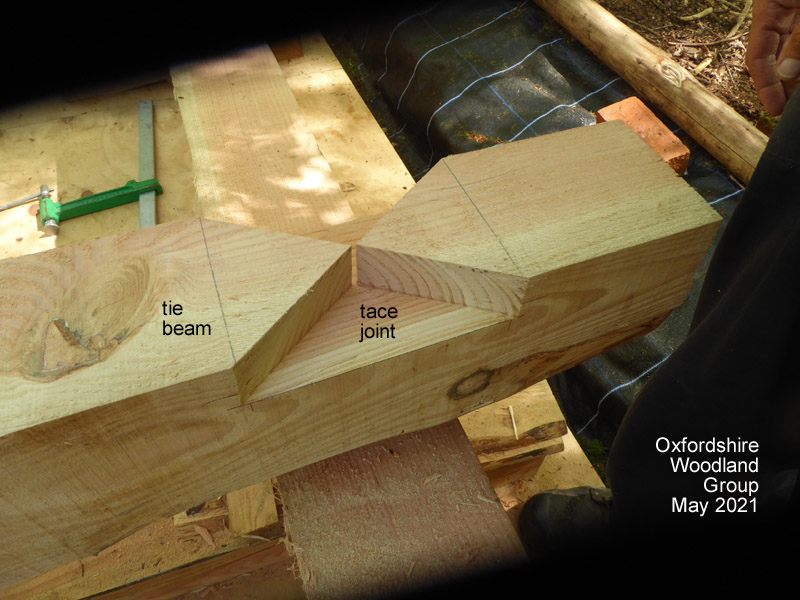 Amidst showers we fitted the tie beams to the wall plates using tace tying joints. The ends of the tie beams were then cambered on the mobile saw to provide a good heartwood standing on which the principal rafters will be framed.