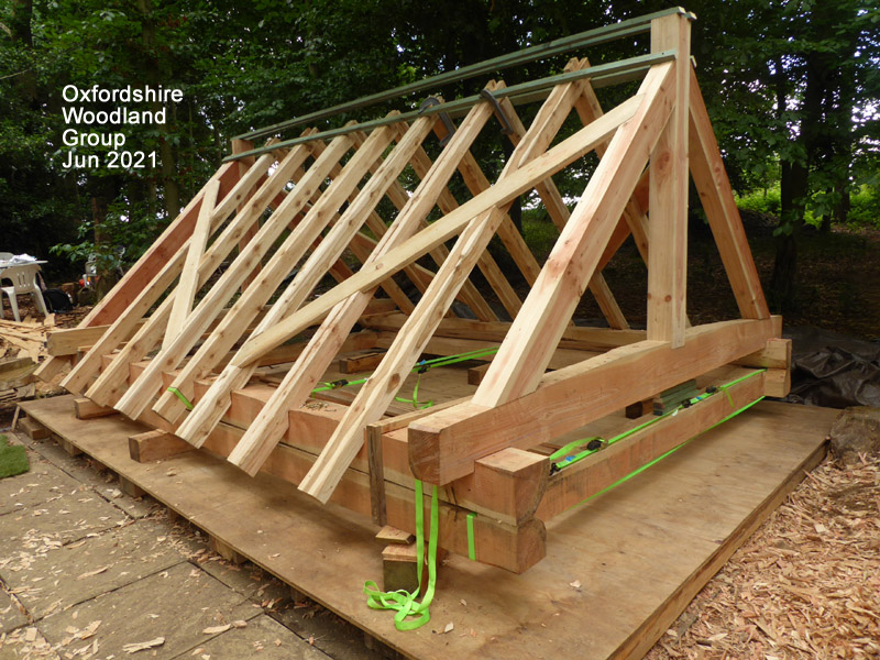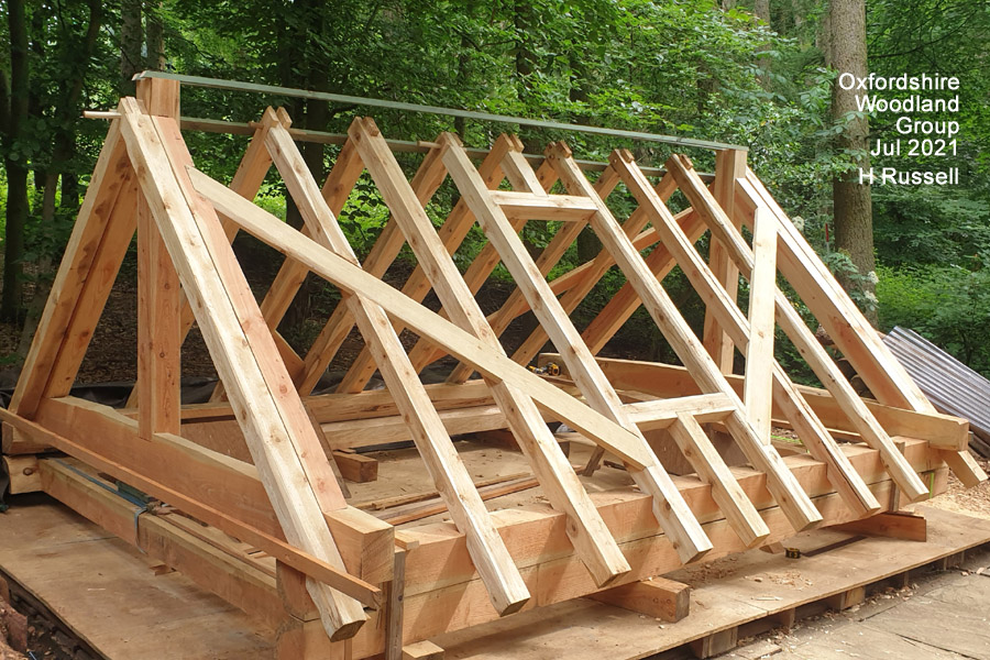 2 common outboard rafters were then clamped alternately to each side of a the centrally housed king post in order to establish the pitch and line of the roof. The king post was housed into the top of the tie beam in order to provide a wider landing on a waney edged timber.